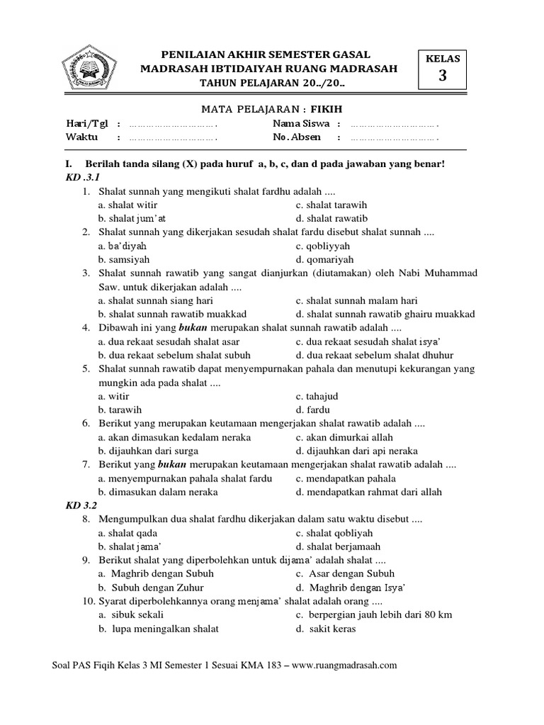 Ujian Akhir Semester (PAS) merupakan salah satu momen krusial dalam perjalanan pendidikan seorang siswa. Bagi siswa Kelas 3 Madrasah Ibtidaiyah (MI), PAS Fiqih menjadi tolok ukur pemahaman mereka terhadap materi ibadah, muamalah, dan akhlak yang telah diajarkan sepanjang semester. Menghadapi ujian ini dengan persiapan yang matang adalah kunci untuk meraih hasil yang memuaskan. Salah satu cara efektif untuk mempersiapkan diri adalah dengan berlatih soal-soal PAS Fiqih tahun-tahun sebelumnya. Artikel ini akan membahas secara mendalam mengenai pentingnya latihan soal, cara efektif mengunduh soal PAS Fiqih Kelas 3 MI, serta tips tambahan untuk memaksimalkan persiapan belajar Anda.